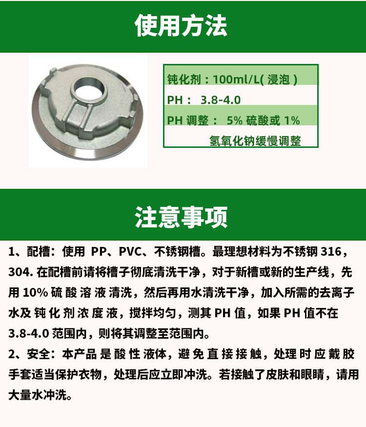 3. 提高产品精密度和附加值 钝化处理能够去除铝材表面的油污和杂质提高产品表面的光洁度和精密度。同时钝化处理后铝材具有更好的耐腐蚀性和使用寿命从而提高了产品的附加值。 4. 环保性能优良 随着环保法规的日益严格环保型钝化剂如无铬钝化剂、水性钝化剂等逐渐受到市场青睐。这类钝化剂符合环保法规要求且性能优良能够在保证钝化效果的同时减少对环境的影响。 5. 操作简便且成本低廉 钝化处理工艺相对简单且操作简便不需要复杂的设备和工艺条件。同时钝化剂可反复添加使用寿命较长成本较低廉。这使得钝化处理在工业生产中具有广泛的应用前景。