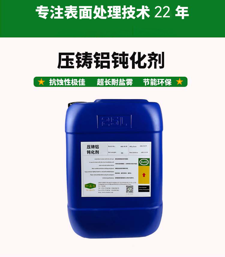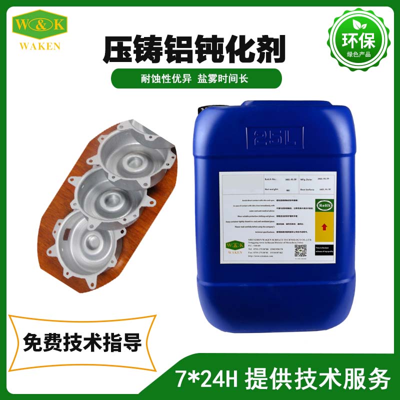 压铸铝钝化剂:专业解析与应用指南发表时间:2026-01-31 16:42网址:http://www.szwaken.com 一、引言 在金属加工领域,压铸铝作为一种重要的材料,以其优异的物理性能和广泛的应用范围受到了广泛的关注。然而,压铸铝在加工和使用过程中,容易受到氧化腐蚀的影响,导致其性能下降和使用寿命缩短。为了有效解决这一问题,压铸铝钝化剂应运而生。作为一名电镀添加剂化工工程师,本文将详细解析压铸铝钝化剂的专业知识,包括其工作原理、工艺流程、市场现状、产品分类以及应用优势等,旨在为读者提供一份详实、具体且具有专业性的指南。 二、压铸铝钝化剂的工作原理 压铸铝钝化是一个重要的表面处理技术,旨在提高铝合金的耐腐蚀性。钝化过程中,铝合金表面会形成一层致密的氧化膜,这层膜能够有效地阻止铝材与外界环境的直接接触,从而减少腐蚀的可能性。 具体来说,钝化剂通过特定的化学反应在铝表面形成保护膜。这种保护膜具有优良的耐腐蚀性,能够抵抗多种腐蚀介质的侵蚀,从而保护铝材免受损害。钝化处理后,铝材不仅具有更好的耐腐蚀性,还能在一定程度上提高其使用寿命和附加值。