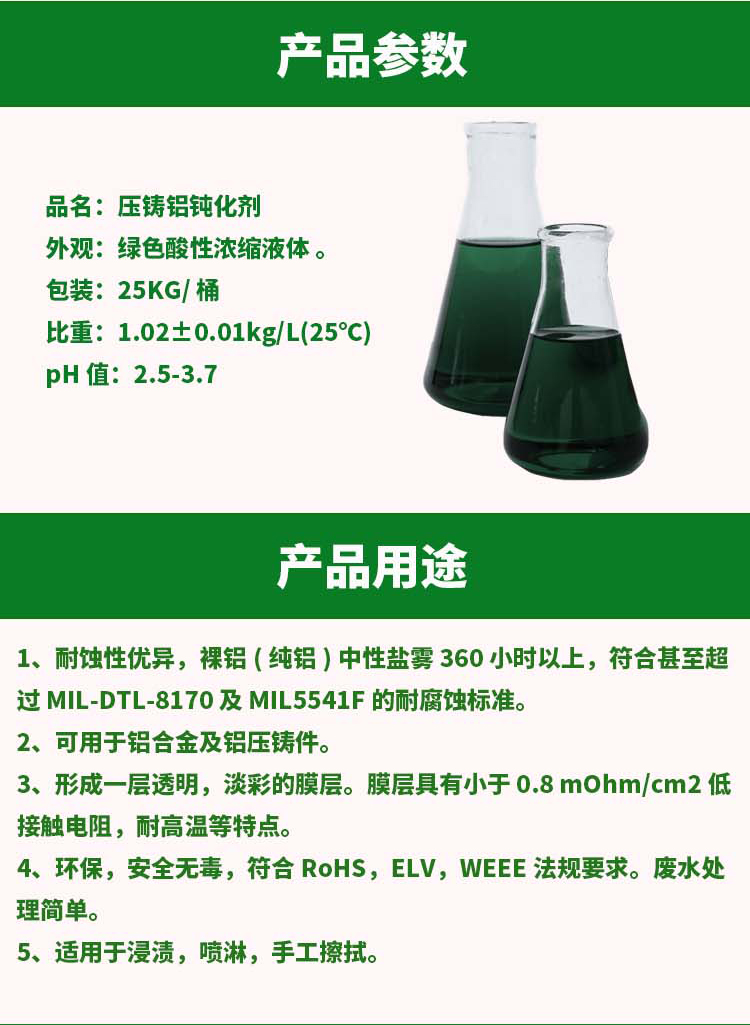 六、压铸铝钝化剂的应用优势 压铸铝钝化剂在铝材表面处理中具有显著的应用优势,以下是一些主要优势: 1. 提高耐腐蚀性 钝化处理后铝材表面形成一层致密的氧化膜能够有效阻止铝材与外界环境的直接接触从而减少腐蚀的可能性。这种保护膜具有优良的耐腐蚀性能够抵抗多种腐蚀介质的侵蚀从而保护铝材免受损害。 2. 不增加工件厚度和改变颜色 钝化处理具有不增加工件厚度和改变颜色的特点保持了铝材原有的尺寸和外观。这使得钝化处理在需要保持铝材原有尺寸和外观的场合下具有显著优势。